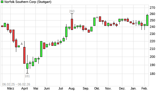 Mit dem Anstieg auf 258,00 EUR hat die Norfolk Southern-Aktie (ISIN US6558441084) am 05.02.2026 ein neues 12-Monats-Hoch erreicht und damit den Kurs vom 06.10.2025 eingestellt.Die Norfolk Southern-Aktie ...weiterlesen