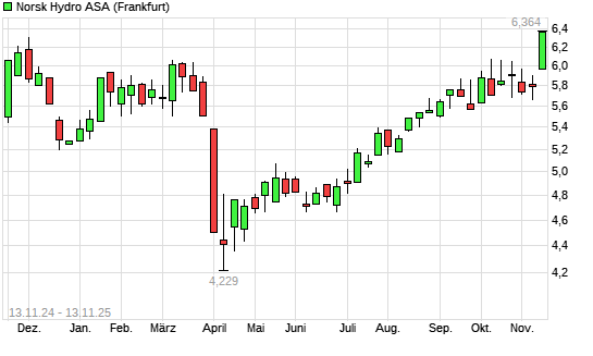 Mit dem Anstieg auf 6,33 EUR hat die Norsk Hydro-Aktie (ISIN NO0005052605) am 12.11.2025 ein neues 12-Monats-Hoch erreicht und damit den Kurs vom 25.11.2024 eingestellt.Die Norsk Hydro-Aktie ...weiterlesen