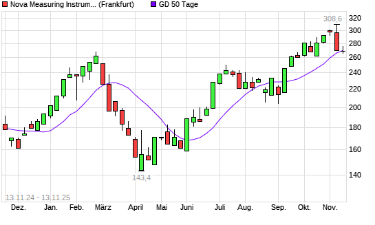 Mit dem Rücksetzer auf 269,00 EUR hat die Nova Measuring-Aktie am 12.11.2025 die 50-Tage-Linie nach unten gekreuzt.Die Nova Measuring-Aktie befindet sich seit dem 16.06.2025 im langfristigen ...weiterlesen