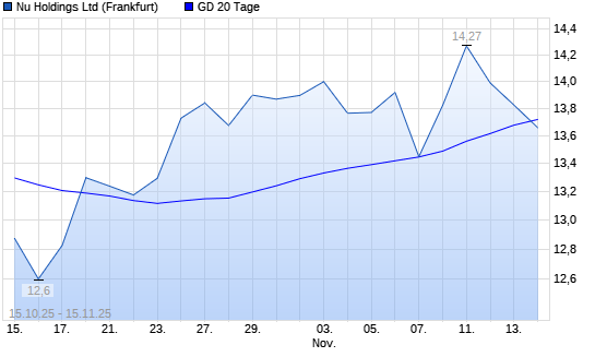 Mit dem Rücksetzer auf 13,66 EUR hat die Nu Holdings-Aktie am 14.11.2025 die 20-Tage-Linie nach unten gekreuzt.Die Nu Holdings-Aktie befindet sich seit dem 15.08.2025 im langfristigen Aufwärtstrend ...weiterlesen