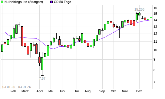 Mit dem Anstieg auf 14,52 EUR hat die Nu Holdings-Aktie am 02.01.2026 die 50-Tage-Linie nach oben gekreuzt.Die Nu Holdings-Aktie befindet sich seit dem 15.08.2025 im ...weiterlesen