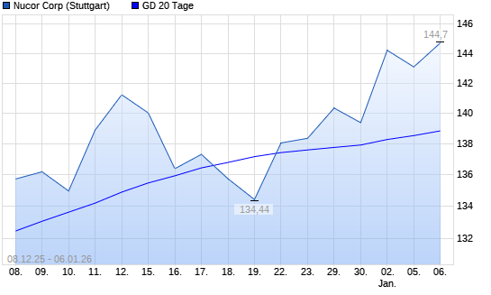 Mit dem Anstieg auf 143,56 EUR hat die Nucor-Aktie am 05.01.2026 die 20-Tage-Linie nach oben gekreuzt.Die Nucor-Aktie befindet sich seit dem 21.10.2025 im langfristigen Aufwärtstrend ...weiterlesen