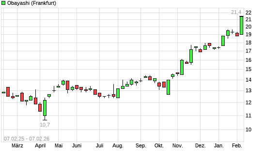 Mit dem Anstieg auf 21,40 EUR hat die Obayashi-Aktie (ISIN JP3190000004) am 06.02.2026 ein neues All-Time-High erreicht und damit den Kurs vom 05.02.2026 eingestellt.Die Obayashi-Aktie befindet ...weiterlesen