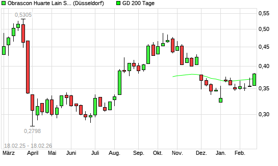 Mit dem Anstieg auf 0,37 EUR hat die Obrascon Huarte Lain-Aktie am 17.02.2026 die 200-Tage-Linie nach oben gekreuzt.Die Obrascon Huarte Lain-Aktie befand sich seit dem 28.01.2026 ...weiterlesen