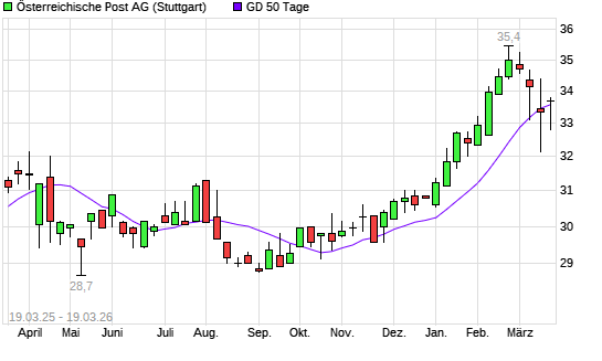 Mit dem Anstieg auf 33,70 EUR hat die Österreichische Post-Aktie am 18.03.2026 die 50-Tage-Linie nach oben gekreuzt.Die Österreichische Post-Aktie befindet sich seit dem 28.11.2025 ...weiterlesen