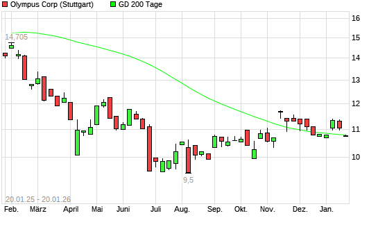 Mit dem Rücksetzer auf 10,73 EUR hat die Olympus-Aktie am 19.01.2026 die 200-Tage-Linie nach unten gekreuzt.Die Olympus-Aktie befand sich seit dem 05.01.2026 im langfristigen Aufwärtstrend ...weiterlesen