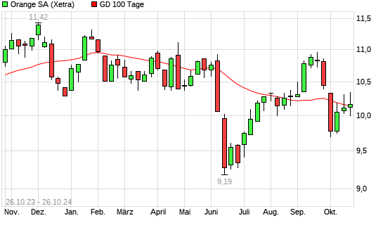 Mit dem Rücksetzer auf 10,09 EUR hat die Orange-Aktie am 25.10.2024 die 100-Tage-Linie nach unten gekreuzt.Die Orange-Aktie befindet sich seit dem 27.09.2024 im langfristigen Abwärtstrend ...weiterlesen