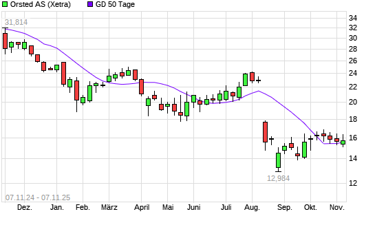 Mit dem Anstieg auf 15,65 EUR hat die Orsted-Aktie am 06.11.2025 die 50-Tage-Linie nach oben gekreuzt.Die Orsted-Aktie befindet sich seit dem 08.08.2025 im langfristigen Abwärtstrend ...weiterlesen