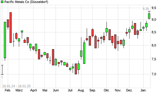 Mit dem Anstieg auf 9,25 EUR hat die Pacific Metals Co-Aktie (ISIN JP3448000004) am 15.01.2025 ein neues 12-Monats-Hoch erreicht und damit den Kurs vom 14.01.2025 eingestellt.Die Pacific Metals ...weiterlesen