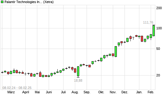 Mit dem Anstieg auf 109,02 EUR hat die Palantir Technologies-Aktie (ISIN US69608A1088) am 07.02.2025 ein neues All-Time-High erreicht und damit den Kurs vom 06.02.2025 eingestellt.Die Palantir ...weiterlesen
