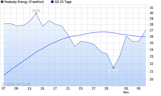 Mit dem Anstieg auf 27,00 EUR hat die Peabody Energy-Aktie am 06.11.2025 die 20-Tage-Linie nach oben gekreuzt.Die Peabody Energy-Aktie befindet sich seit dem 04.09.2025 im langfristigen Aufwärtstrend ...weiterlesen