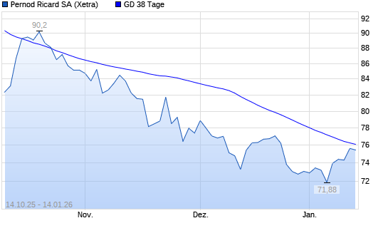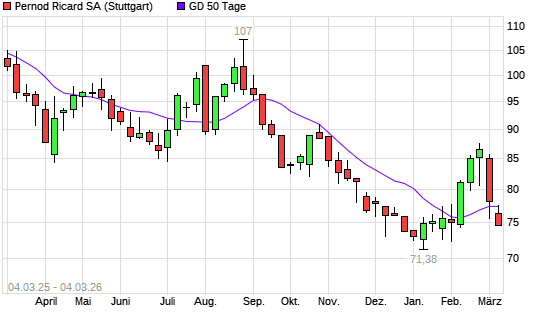 Mit dem Rücksetzer auf 75,60 EUR hat die Pernod Ricard-Aktie am 03.03.2026 die 50-Tage-Linie nach unten gekreuzt.Die Pernod Ricard-Aktie befindet sich seit dem 23.02.2026 ...weiterlesen