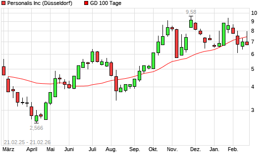 Mit dem Rücksetzer auf 6,96 EUR hat die Personalis-Aktie am 20.02.2026 die 100-Tage-Linie nach unten gekreuzt.Die Personalis-Aktie befindet sich seit dem 08.09.2025 im ...weiterlesen