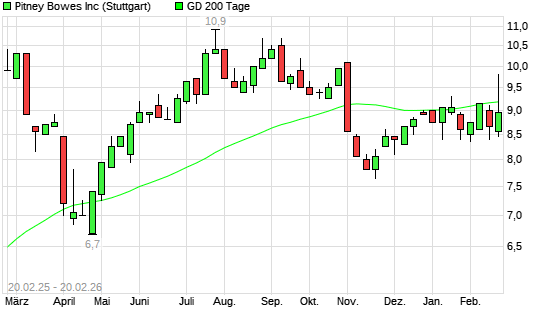 Mit dem Anstieg auf 9,20 EUR hat die Pitney Bowes-Aktie am 19.02.2026 die 200-Tage-Linie nach oben gekreuzt.Die Pitney Bowes-Aktie befand sich seit dem 19.01.2026 im ...weiterlesen