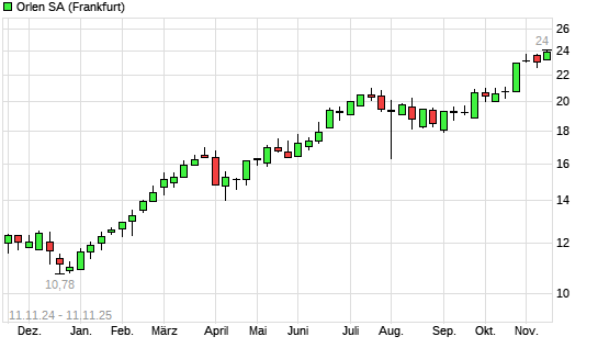 Mit dem Anstieg auf 23,84 EUR hat die Polski Koncern Naftowy Orlen-Aktie (ISIN PLPKN0000018) am 10.11.2025 ein neues 5-Jahres-Hoch erreicht und damit den Kurs vom 30.10.2025 eingestellt.Die ...weiterlesen