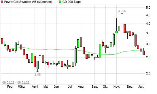 Mit dem Rücksetzer auf 2,60 EUR hat die PowerCell Sweden-Aktie am 08.01.2026 die 200-Tage-Linie nach unten gekreuzt.Die PowerCell Sweden-Aktie befand sich seit dem 05.01.2026 im langfristigen ...weiterlesen