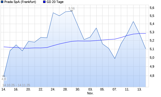 Mit dem Rücksetzer auf 5,28 EUR hat die Prada-Aktie am 13.11.2025 die 20-Tage-Linie nach unten gekreuzt.Die Prada-Aktie befindet sich seit dem 14.03.2025 im langfristigen Abwärtstrend und ...weiterlesen