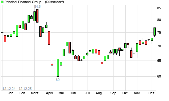 Mit dem Anstieg auf 77,50 EUR hat die Principal Financial-Aktie (ISIN US74251V1026) am 12.12.2025 ein neues 6-Monats-Hoch erreicht und damit den Kurs vom 11.12.2025 eingestellt.Die Principal ...weiterlesen