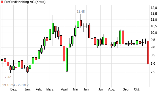 Mit dem Rücksetzer auf 7,98 EUR hat die ProCredit Holding-Aktie (ISIN DE0006223407) am 28.10.2025 ein neues 6-Monats-Tief erreicht und damit den Kurs vom 21.07.2025 eingestellt.Die ProCredit ...weiterlesen