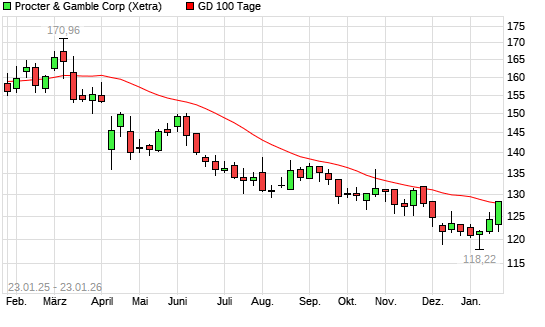 Mit dem Anstieg auf 128,20 EUR hat die Procter & Gamble-Aktie am 22.01.2026 die 100-Tage-Linie nach oben gekreuzt.Die Procter & Gamble-Aktie befindet sich seit dem 12.03.2025 im langfristigen ...weiterlesen