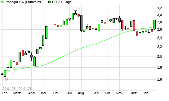 Mit dem Anstieg auf 2,85 EUR hat die Prosegur-Aktie am 23.01.2026 die 200-Tage-Linie nach oben gekreuzt.Die Prosegur-Aktie befand sich seit dem 05.12.2025 im langfristigen Abwärtstrend und hat ...weiterlesen