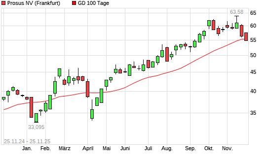 Mit dem Rücksetzer auf 54,85 EUR hat die Prosus-Aktie am 24.11.2025 die 100-Tage-Linie nach unten gekreuzt.Die Prosus-Aktie befindet sich seit dem 17.04.2025 im langfristigen Aufwärtstrend ...weiterlesen