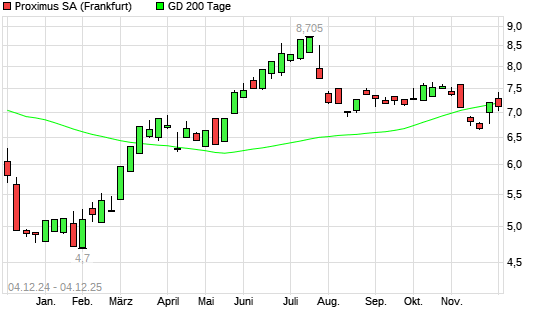 Mit dem Rücksetzer auf 7,18 EUR hat die Proximus-Aktie am 03.12.2025 die 200-Tage-Linie nach unten gekreuzt.Die Proximus-Aktie befand sich seit dem 28.11.2025 im langfristigen Abwärtstrend ...weiterlesen