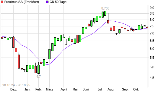 Mit dem Anstieg auf 7,48 EUR hat die Proximus-Aktie am 29.10.2025 die 50-Tage-Linie nach oben gekreuzt.Die Proximus-Aktie befindet sich seit dem 10.04.2025 im langfristigen Aufwärtstrend und ...weiterlesen
