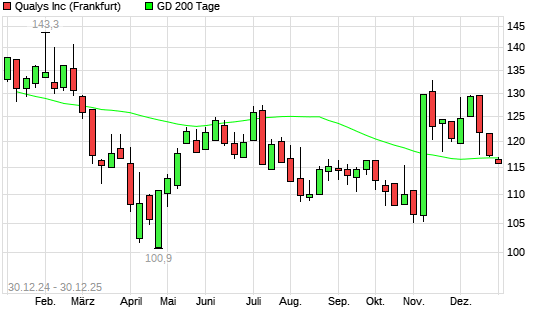 Mit dem Rücksetzer auf 116,40 EUR hat die Qualys-Aktie am 29.12.2025 die 200-Tage-Linie nach unten gekreuzt.Die Qualys-Aktie befand sich seit dem 06.11.2025 im langfristigen Aufwärtstrend ...weiterlesen