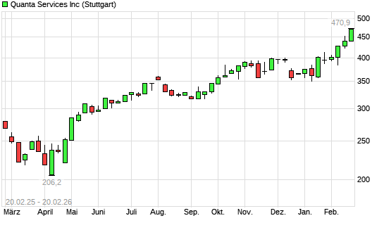 Mit dem Anstieg auf 475,70 EUR hat die Quanta Services-Aktie (ISIN US74762E1029) am 19.02.2026 ein neues All-Time-High erreicht und damit den Kurs vom 18.02.2026 eingestellt.Die ...weiterlesen