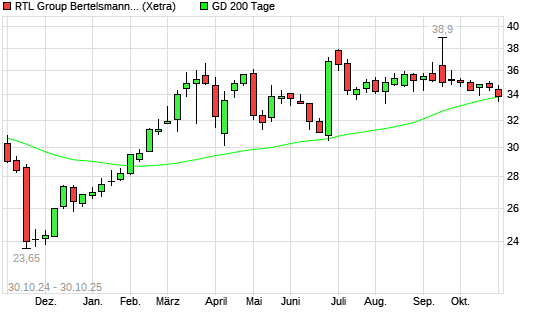 Mit dem Rücksetzer auf 33,80 EUR hat die RTL-Aktie am 29.10.2025 die 200-Tage-Linie nach unten gekreuzt.Die RTL-Aktie befand sich seit dem 24.06.2025 im langfristigen Abwärtstrend und hat ...weiterlesen