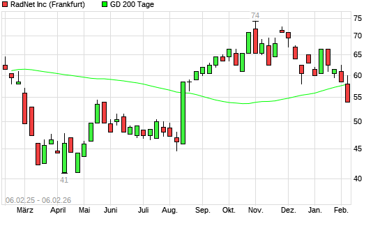 Mit dem Rücksetzer auf 57,00 EUR hat die RadNet-Aktie am 05.02.2026 die 200-Tage-Linie nach unten gekreuzt.Die RadNet-Aktie befand sich seit dem 03.02.2026 im langfristigen Aufwärtstrend ...weiterlesen