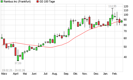 Mit dem Rücksetzer auf 87,44 EUR hat die Rambus-Aktie am 19.02.2026 die 38-Tage-Linie nach unten gekreuzt.Die Rambus-Aktie befindet sich seit dem 04.06.2025 im ...weiterlesen