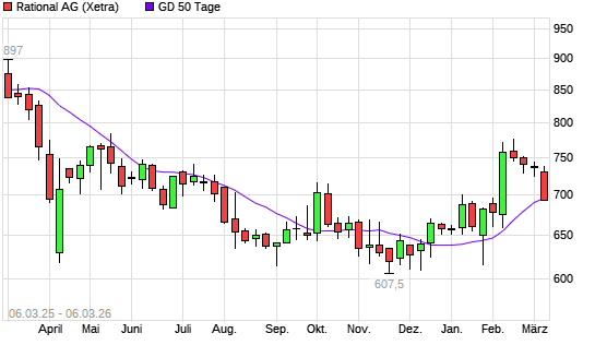 Mit dem Rücksetzer auf 690,50 EUR hat die Rational-Aktie am 05.03.2026 die 50-Tage-Linie nach unten gekreuzt.Die Rational-Aktie befindet sich seit dem 05.02.2026 im ...weiterlesen