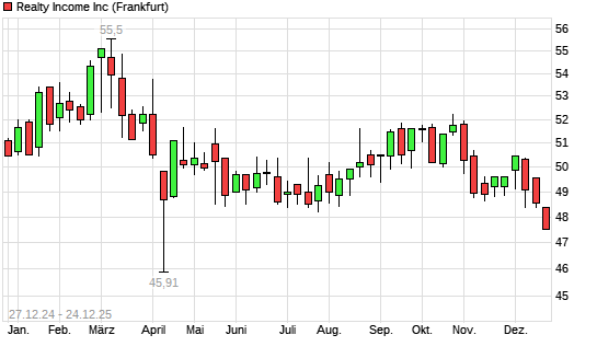 Mit dem Rücksetzer auf 47,50 EUR hat die Realty Income-Aktie (ISIN US7561091049) am 23.12.2025 ein neues 12-Monats-Tief erreicht und damit den Kurs vom 08.04.2025 eingestellt.Die Realty ...weiterlesen