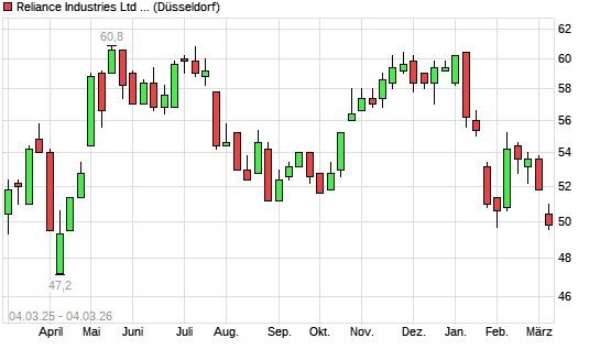 Mit dem Rücksetzer auf 50,00 EUR hat die Reliance Industries GDR-Aktie (ISIN US7594701077) am 03.03.2026 ein neues 6-Monats-Tief erreicht und damit den Kurs vom ...weiterlesen