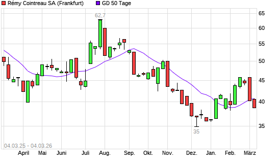 Mit dem Rücksetzer auf 39,92 EUR hat die Remy Cointreau-Aktie am 03.03.2026 die 50-Tage-Linie nach unten gekreuzt.Die Remy Cointreau-Aktie befindet sich seit dem 28.10.2025 ...weiterlesen