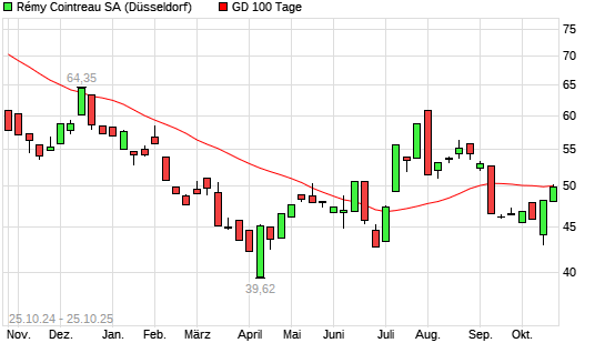 Mit dem Rücksetzer auf 49,84 EUR hat die Remy Cointreau-Aktie am 24.10.2025 die 100-Tage-Linie nach unten gekreuzt.Die Remy Cointreau-Aktie befindet sich seit dem 23.10.2025 im langfristigen ...weiterlesen