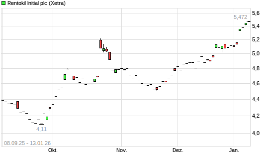 Mit dem Anstieg auf 5,50 EUR hat die Rentokil Initial-Aktie (ISIN GB00B082RF11) am 12.01.2026 ein neues 12-Monats-Hoch erreicht und damit den Kurs vom 09.01.2026 eingestellt.Die Rentokil Initial-Aktie ...weiterlesen