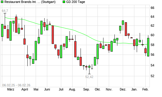 Mit dem Anstieg auf 59,22 EUR hat die Restaurant Brands International-Aktie am 05.02.2026 die 200-Tage-Linie nach oben gekreuzt.Die Restaurant Brands International-Aktie befand sich seit dem ...weiterlesen
