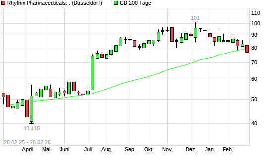 Mit dem Rücksetzer auf 76,50 EUR hat die Rhythm Pharmaceuticals-Aktie am 27.02.2026 die 200-Tage-Linie nach unten gekreuzt.Die Rhythm Pharmaceuticals-Aktie befand sich seit ...weiterlesen