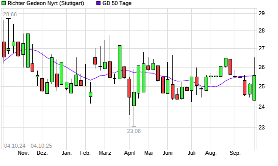 Mit dem Rücksetzer auf 25,96 EUR hat die Richter Gedeon-Aktie am 03.10.2025 die 50-Tage-Linie nach unten gekreuzt.Die Richter Gedeon-Aktie befindet sich seit dem 01.10.2025 im langfristigen ...weiterlesen