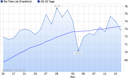 Mit dem Rücksetzer auf 72,80 EUR hat die Rio Tinto-Aktie am 14.11.2025 die 20-Tage-Linie nach unten gekreuzt.Die Rio Tinto-Aktie befindet sich seit dem 25.09.2025 im langfristigen Aufwärtstrend ...weiterlesen