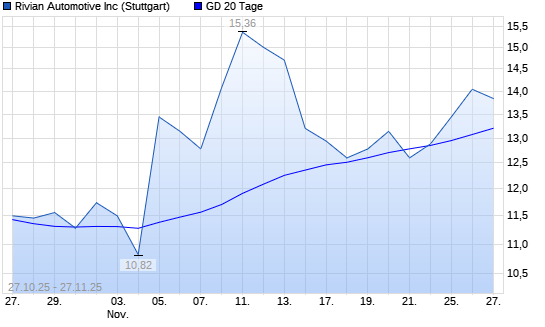 Mit dem Anstieg auf 13,32 EUR hat die Rivian Automotive-Aktie am 26.11.2025 die 20-Tage-Linie nach oben gekreuzt.Die Rivian Automotive-Aktie befindet sich seit dem 05.11.2025 im langfristigen ...weiterlesen