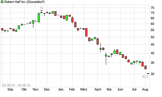 Mit dem Rücksetzer auf 30,40 EUR hat die Robert Half International-Aktie (ISIN US7703231032) am 04.08.2025 ein neues 10-Jahres-Tief erreicht und damit den Kurs vom 28.06.2016 eingestellt.Die ...weiterlesen