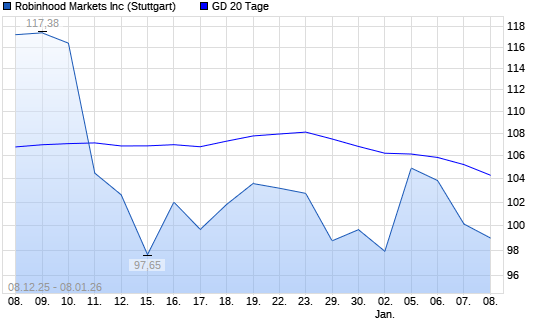 Mit dem Rücksetzer auf 100,26 EUR hat die Robinhood A-Aktie am 07.01.2026 die 20-Tage-Linie nach unten gekreuzt.Die Robinhood A-Aktie befindet sich seit dem 09.04.2025 im langfristigen ...weiterlesen