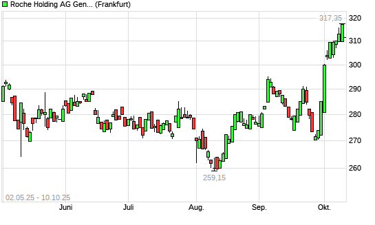 Mit dem Anstieg auf 317,35 EUR hat die Roche Genussscheine-Aktie (ISIN CH0012032048) am 09.10.2025 ein neues 6-Monats-Hoch erreicht und damit den Kurs vom 08.10.2025 eingestellt.Die Roche Genussscheine-Aktie ...weiterlesen