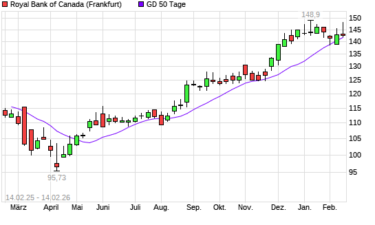 Mit dem Rücksetzer auf 142,44 EUR hat die Royal Bank Canada-Aktie am 13.02.2026 die 50-Tage-Linie nach unten gekreuzt.Die Royal Bank Canada-Aktie befindet sich seit dem 06.08.2025 im ...weiterlesen