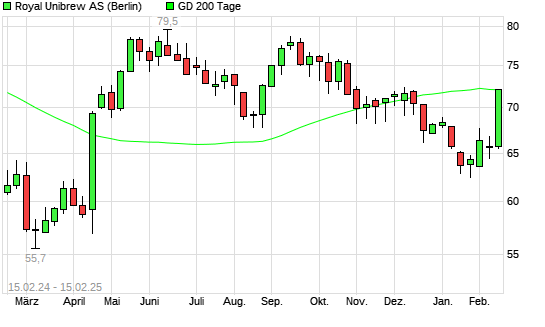 Mit dem Anstieg auf 72,15 EUR hat die Royal Unibrew Ord Shs-Aktie am 14.02.2025 die 200-Tage-Linie nach oben gekreuzt.Die Royal Unibrew Ord Shs-Aktie befand sich seit dem 09.12.2024 im langfristigen ...weiterlesen