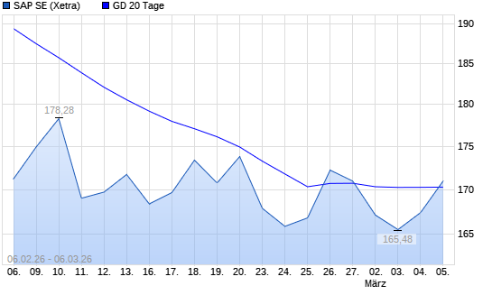 Mit dem Anstieg auf 171,64 EUR hat die SAP-Aktie am 05.03.2026 die 20-Tage-Linie nach oben gekreuzt.Die SAP-Aktie befindet sich seit dem 11.08.2025 im langfristigen Abwärtstrend und hat ...weiterlesen